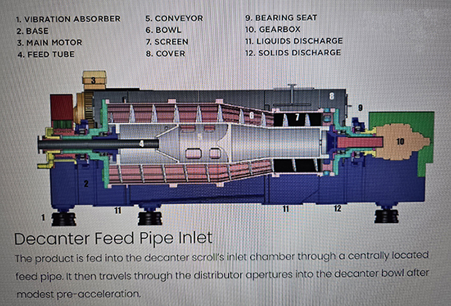스크류 데칸타 구동원리 - 고속으로 회전하는 Bowl 내부로 서로 다른 비중을 가진 2상 및 3상의 분리가 요구되는 슬러지를 투입시켜, 고속 회전시 발생되는 원심력을 이용하여 2상 및 3상으로 슬러지를 분리함. 분리된 고형물은 Bowl 및 Screw의 일정한 차속을 이용하여 고형물을 탈수하여 Bowl 외부로 배출하고 분리된 액체 역시 배출구를 통해 외부로 배출하는 방식입니다.